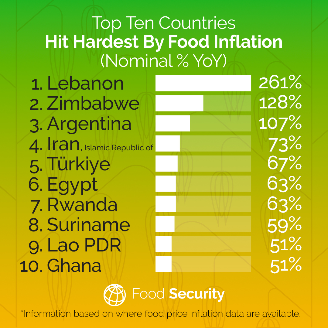 كشفت ارقام البنك الدولي المحدّثة للأمن الغذائي – والتي تُبيّن نسب التغيّر السنويّة لمؤشّر الغذاء في مؤشّر تضخّم الأسعار في عدد من البلدان حول العالم – عن تسجيل لبنان أعلى نسبة تضخّم إسميّة في أسعار الغذاء حول العالم بين الفترة الممتدّة بين شهر شباط 2022 وشهر شباط 2023 (261 في المئة، نسبة تغيّر سنويّة في مؤشّر تضخّم أسعار الغذاء)، وقد تخطّى بذلك زيمبابوي (128 في المئة).