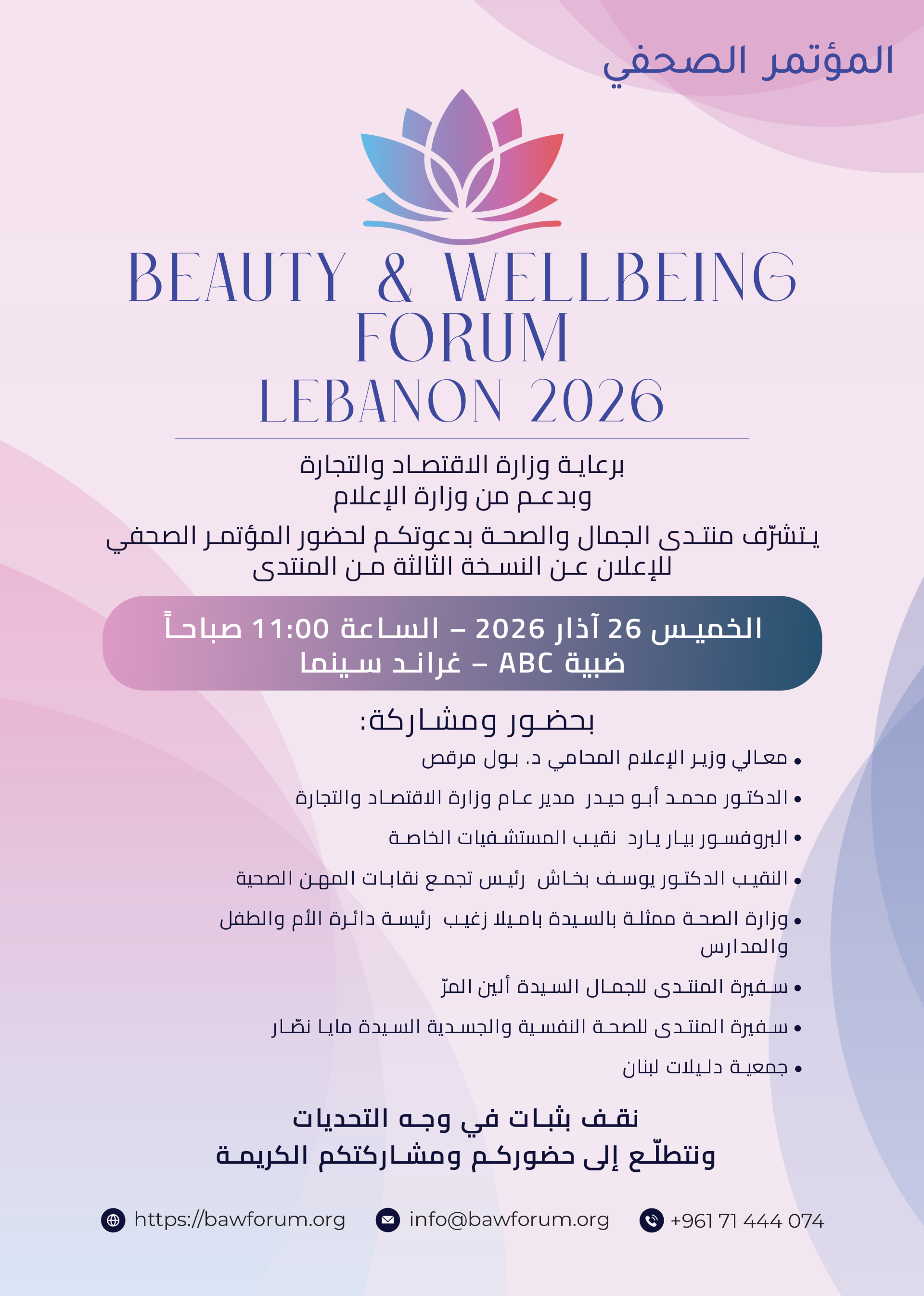 almontasher :دعامنتدى الجمال والصحة لبنان 2026 والذي يُقام برعاية وزارة الاقتصاد والتجارة وبدعم من وزارة الإعلام، الى حضور مؤتمره …
