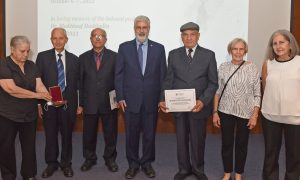 President Khuri presented the university medal to the Haddadin family, represented by Dr. Makhlouf’s brother, Dr. Munther Haddadin, who said, “We are grateful that this grand institution of education and learning has unanimously decided to bestow on Makhlouf this very high honor in recognition of his continuous service to it as a teacher and a researcher. He happily lived a few yards away from his favorite laboratory, lecture halls, and office. We can see that Makhlouf’s legacy will live on.”
