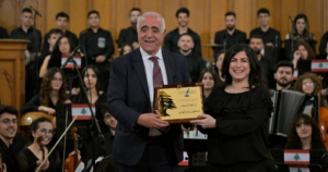 وقدم القصيفي درعا تكريمية لرئيسة المعهد الوطني للموسيقى، معتبرا أنها “درع وطني وفني يهدى لبنان الأمل والإبداع الدائم”.
