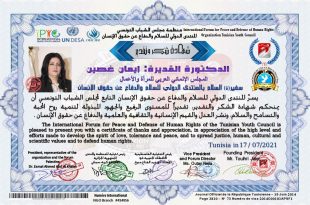 منح المنتدى الدولي للسلام والدفاع عن حقوق الانسان الدكتورة ايمان غصين رئيسة المجلس الانمائي العربي للمرأة والاعمال لقب سفيرة للسلام . وحصلت الدكتورة غصين على الوسام الفخري التابع لمجلس الشباب التونسي تقديرا لجهودها المبذولة في تنمية المحبة والتسامح والسلام ونشر العدل والقيم الانسانية والثقافية والدفاع عن حقوق الانسان وعبرت الدكتورة …