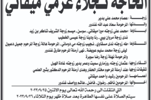 انقر الصورة لقراءة النعي غيب الموت مساء اليوم السيدة نجلاء ميقاتي بدير شقيقة رئيس الحكومة نجيب ميقاتي.وستقبل التعازي في بيروت نهار الاثنين ٢٠٢٣/١٠/٢ في بافيون الواجهة البحرية (البيال سابقاً) من الساعة العاشرة حتى الثانية عشرة ظهراً ومن الساعة الثالثة حتى السابعة مساءً.
