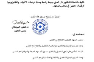 الضغط على اي صورة لتكبيرها اصدر مجلس المعهد العالمي للتجديد قرارا كلف بموجبه الاستاذ الدكتور دال الحتي بمهمة رئاسة وحدة دراسات الانترنت والتكنولوجيا الرقمية وعضوا في مجلس المعهد. وقد وقع القرار رئيس المعهد الدكتور خضير المرشدي الذي تمنى للدكتور الحتي التوفيق والنجاح في مهامه