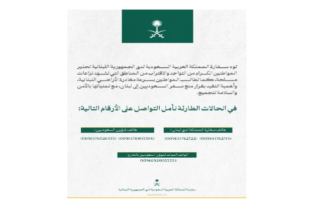 اضغط على الصورة لقراءة البيان حذرت السفارة السعودية في لبنان عبر حسابها على “تويتر”، رعاياها في لبنان من “الاقتراب من المناطق التي تشهد نزاعات مسلحة”، ودعتهم “بسرعة الى مغادرة الأراضي اللبنانية”.