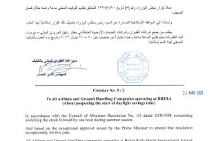 أصدرت وزارة الأشغال العامة والنقل قراراً أبلغت فيه كل شركات الطيران وشركات الخدمات الأرضية العاملة في مطار رفيق الحريري الدولي – بيروت بانه سيتم تقديم الساعة ساعة واحدة اعتباراً من منتصف ليل 20 – 21 نيسان 2023، تاريخ بدء العمل بالتوقيت الصيفي لهذا العام استثنائياً