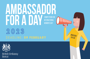 فرصة للفتيات في لبنان ليصبحن سفيرة ليوم واحد OPPORTUNITY FOR GIRLS IN LEBANON TO BECOME AN AMBASSADOR FOR A DAY تطلق السفارة البريطانية في بيروت مسابقة “Ambassador For A Day” سفيرة ليوم واحد” حيث ستتمكن الفائزات من مواكبة سفير في لبنان ليوم واحد. تهدف المسابقة إلى تشجيع الفتيات على أن يصبحن قائدات …