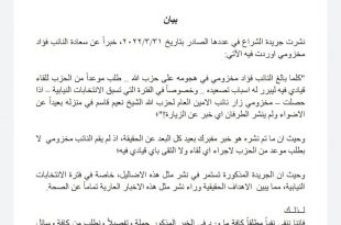 صدر عن مكتب النائب فؤاد مخزومي البيان التالي: نشرت جريدة “الشراع” في عددها الصادر بتاريخ ۲۰۲۲/۳/۳۱، خبراً عن سعادة النائب فؤاد مخزومي اوردت فيه الآتي: “كلما بالغ النائب فؤاد مخزومي في هجومه على حزب الله .. طلب موعداً من الحزب للقاء قيادي فيه ليبرر له اسباب تصعيده .. وخصوصاً في الفترة …